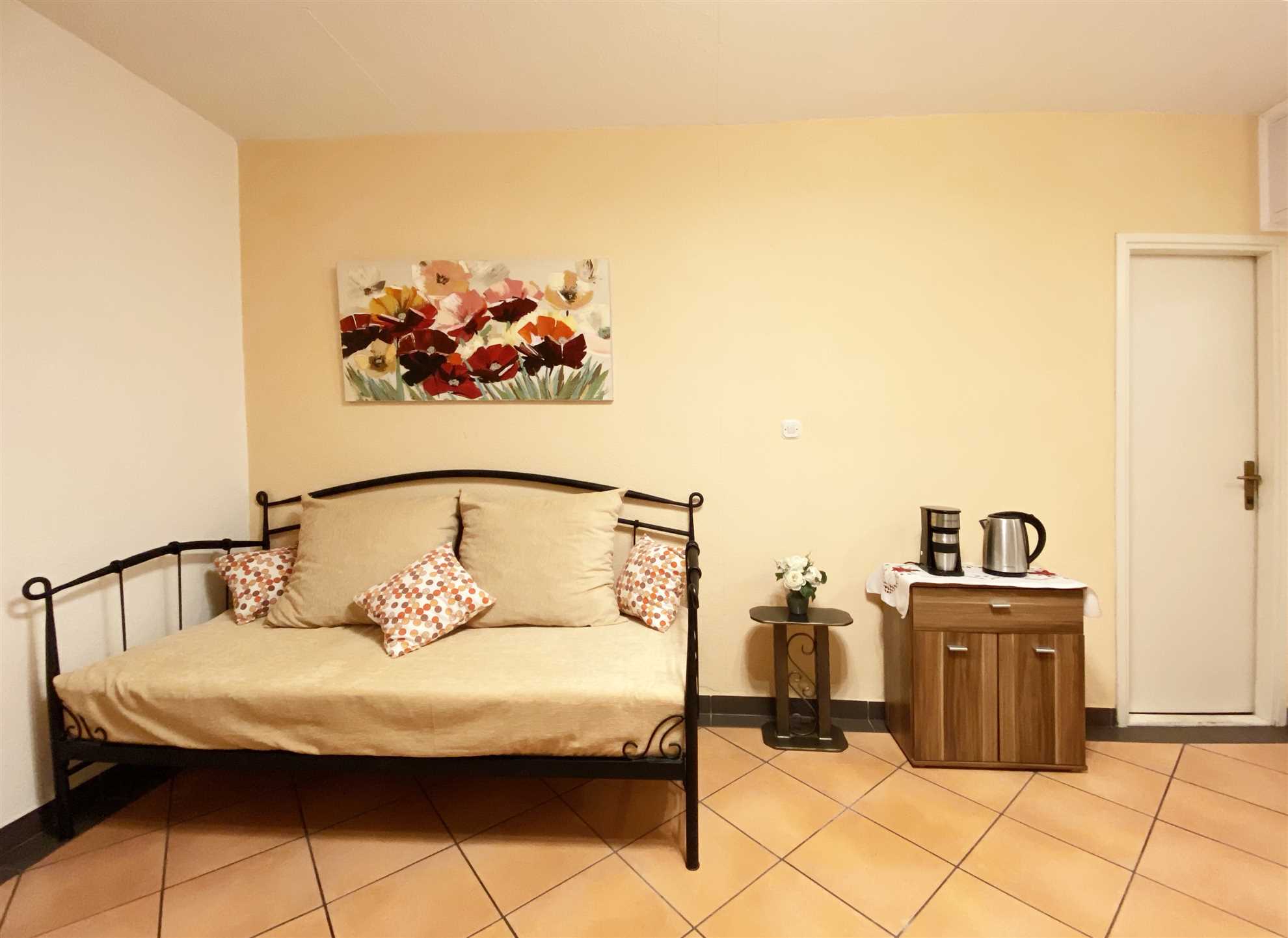 Located in a quiet neighbourhood, the single-storey apartment/house (about 40 m2 or 430 ft2) consists of a bedroom with a Queen sized bed (or 2 single beds), a kitchenette, a bathroom with shower and a hair dryer, a living room with a daybed, air-conditioning, UHD satellite TV and wireless internet. Guests are provided with bed linen and towels.